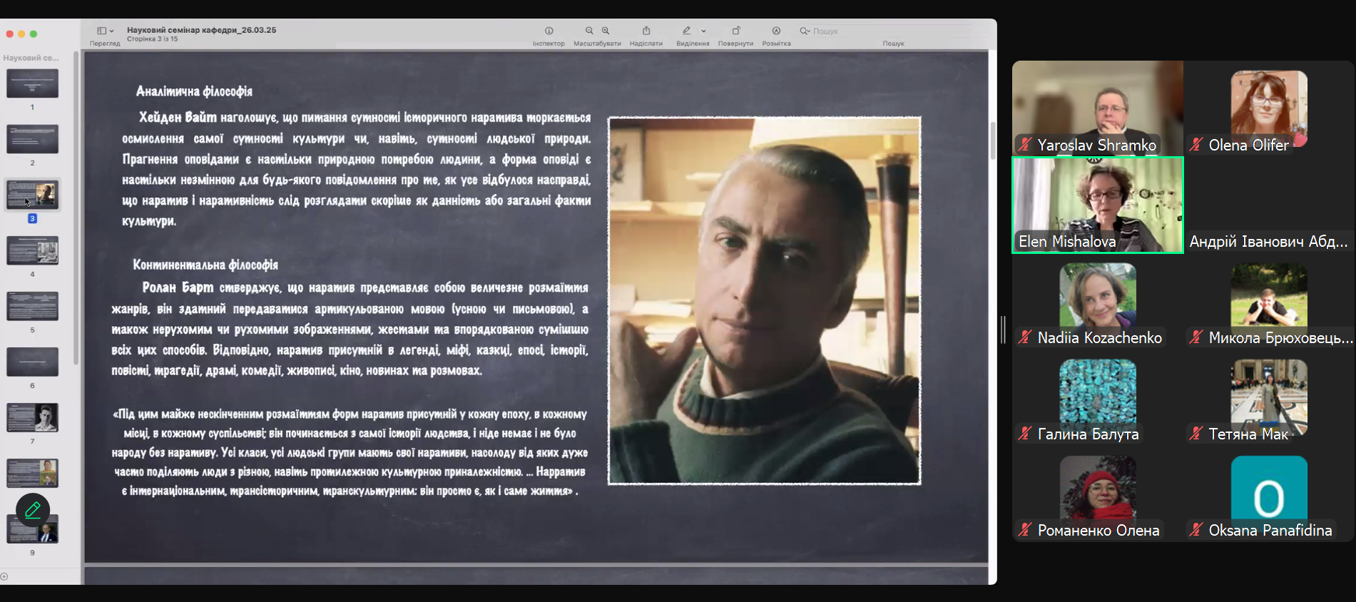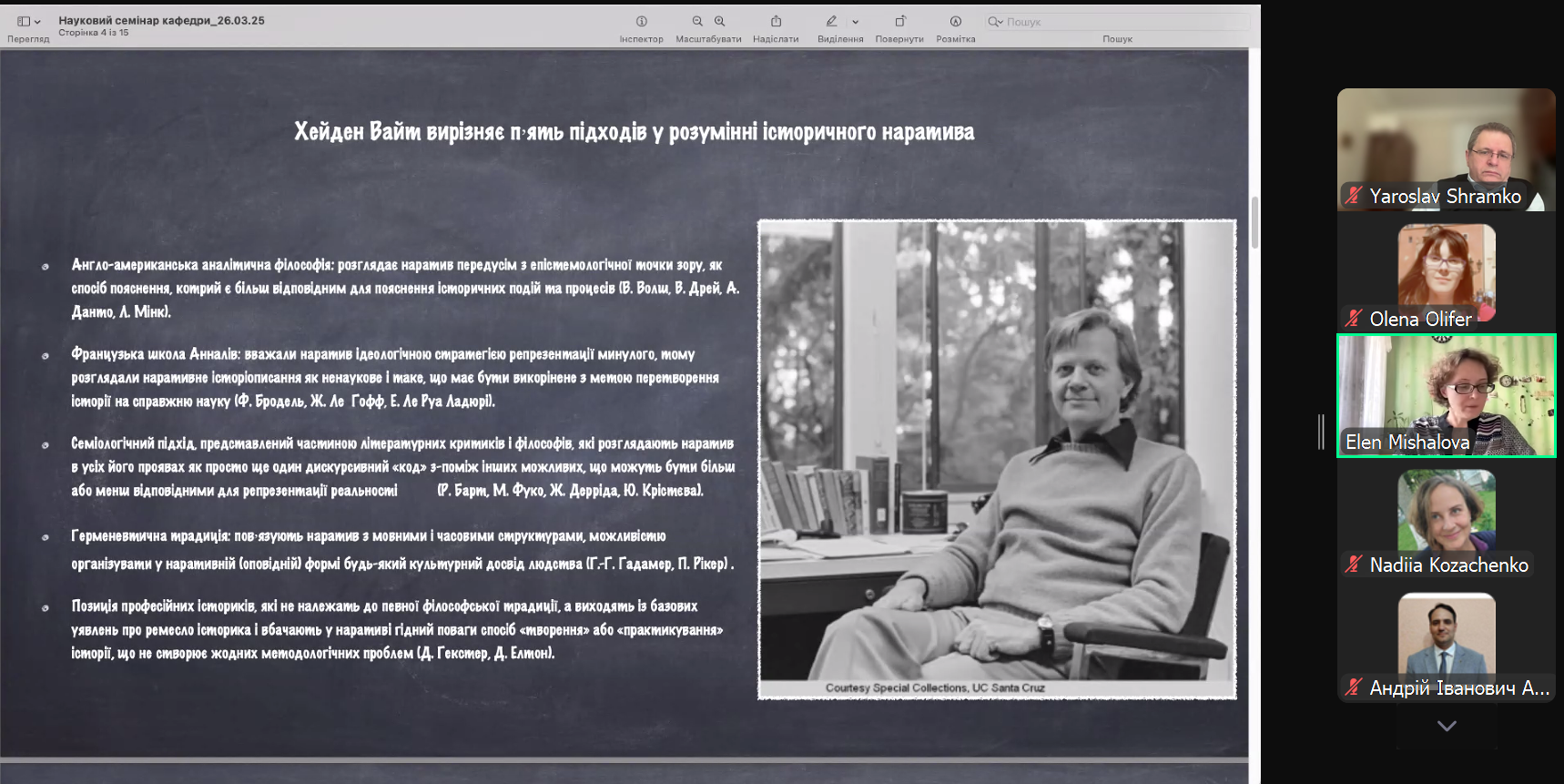 26 березня 2025 року на кафедрі філософії Криворізького державного педагогічного університету відбулося чергове засідання науково-методологічного семінару. З доповіддю на тему "Наратив культурної конвергенції як концептуальний інструмент в сучасній філософії історії" виступила кандидат філософських наук, доцент О. В. Мішалова, яка продемонструвала, що через поступові зміни способів написання історії, тобто організації репрезентації історичного знання, виникає історичний наратив на засадах культурної конвергенції різних етнічних, релігійних, гендерних груп.