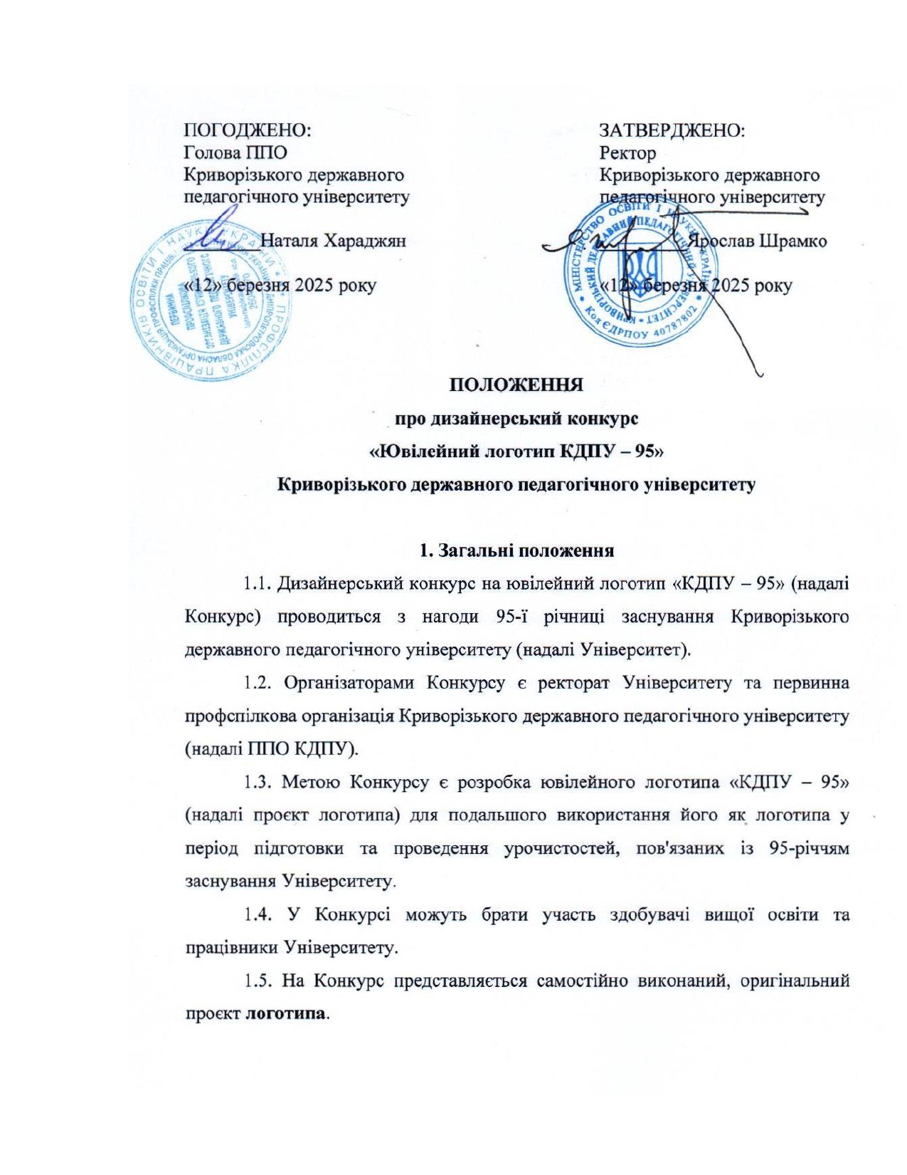Цьогоріч Криворізький педагогічний святкує ювілей – дев’яносто п’яту річницю заснування. У березні-квітні 2025 року серед студентів та працівників університету тривав дизайнерський конкурс «Ювілейний логотип КДПУ – 95», метою якого стало створення символу Альма-матер для використання у період підготовки та проведення ювілейних урочистостей.