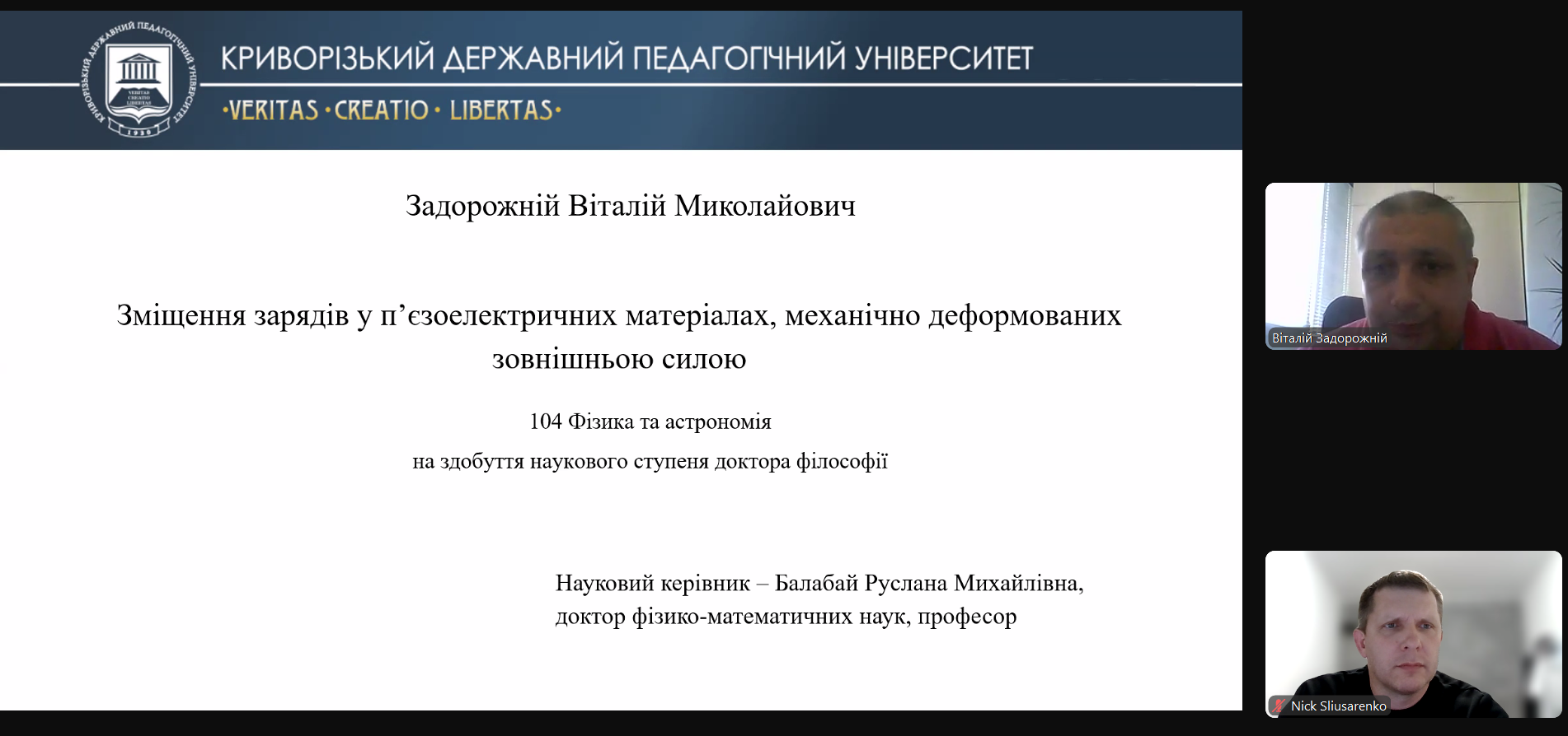 7 травня 2025 року відбулося розширене засідання кафедри фізики та методики її навчання щодо публічної презентації здобувачем Задорожнім Віталієм Миколайовичем наукових результатів дисертаційної праці на тему: «Зміщення зарядів у п’єзоелектричних матеріалах, механічно деформованих зовнішньою силою», що подається на здобуття ступеня доктора філософії.