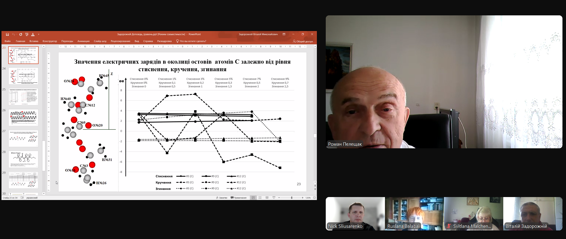 Далі, слідувало обговорення представлених Задорожнім Віталієм Миколайовичем результатів - запитання по доповіді, виступи експертів із запитаннями та зауваженнями по дисертації, виступи присутніх. Так,  Пелещак Роман Михайлович, професор кафедри інформаційних систем та мереж Національного університету «Львівська політехніка» ствердив, що напрямок наукових досліджень Задорожнього Віталія актуальний, результати – достовірні, мають наукову новизну та практичну цінність, що забезпечується їх апробаціями на авторитетних міжнародних конференціях та публікаціями у скопусних виданнях. Роман Михайлович додав, що наукові пошуки здобувача здійснювалися  за підтримки наукової школи «Реалістичне фізико-хімічне портретування нанорозмірних систем», яка діє на кафедрі під керівництвом професора Балабай Руслани Михайлівни та має багаторічні визнання досягнень представників наукової школи.