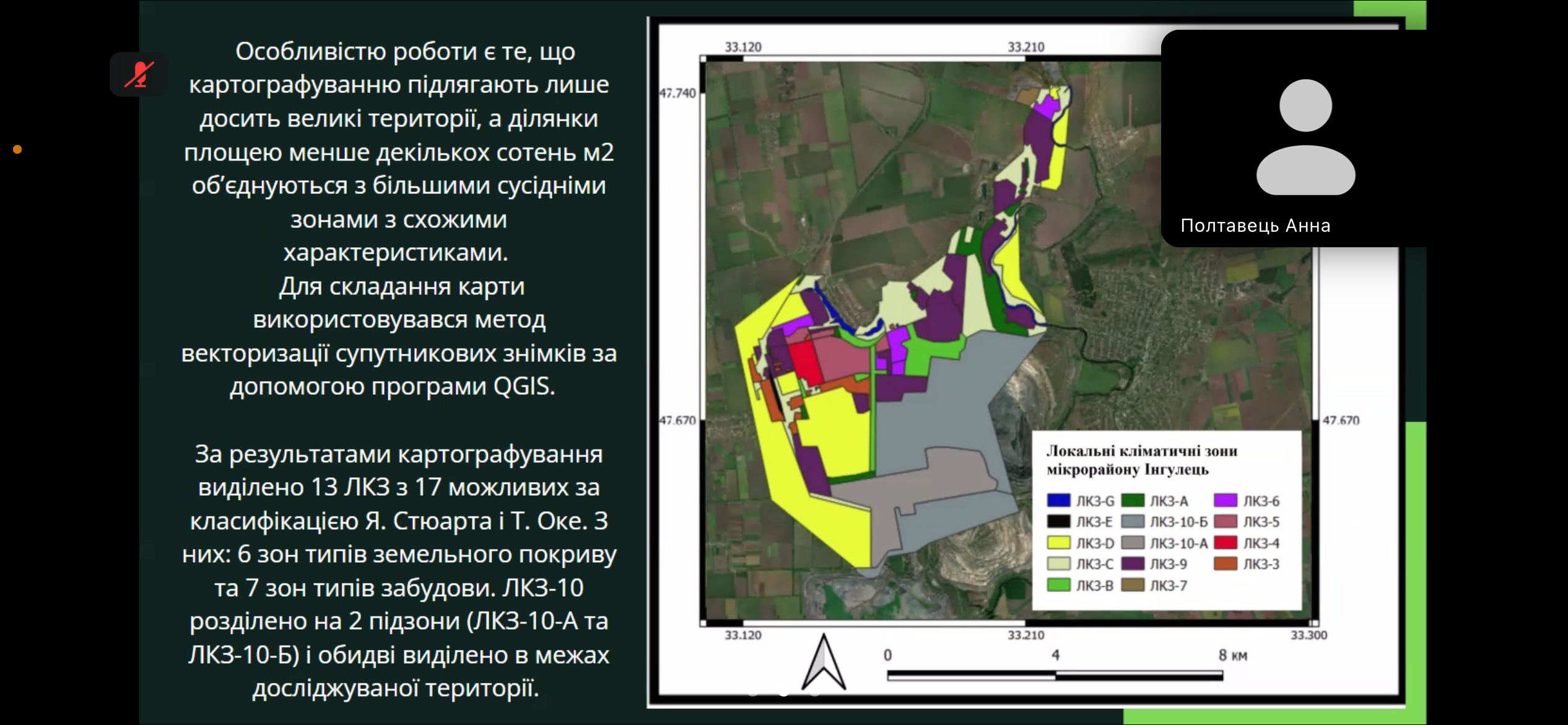 Анна Полтавець розповіла про можливість територіальних громад використовувати в містобудуванні особливості локальних кліматичних зон (наукове дослідження на тему «Геоінформаційне картографування локальних кліматичних зон мікрорайону Інгулець міста Кривий Ріг»).