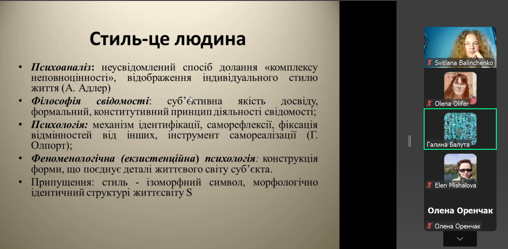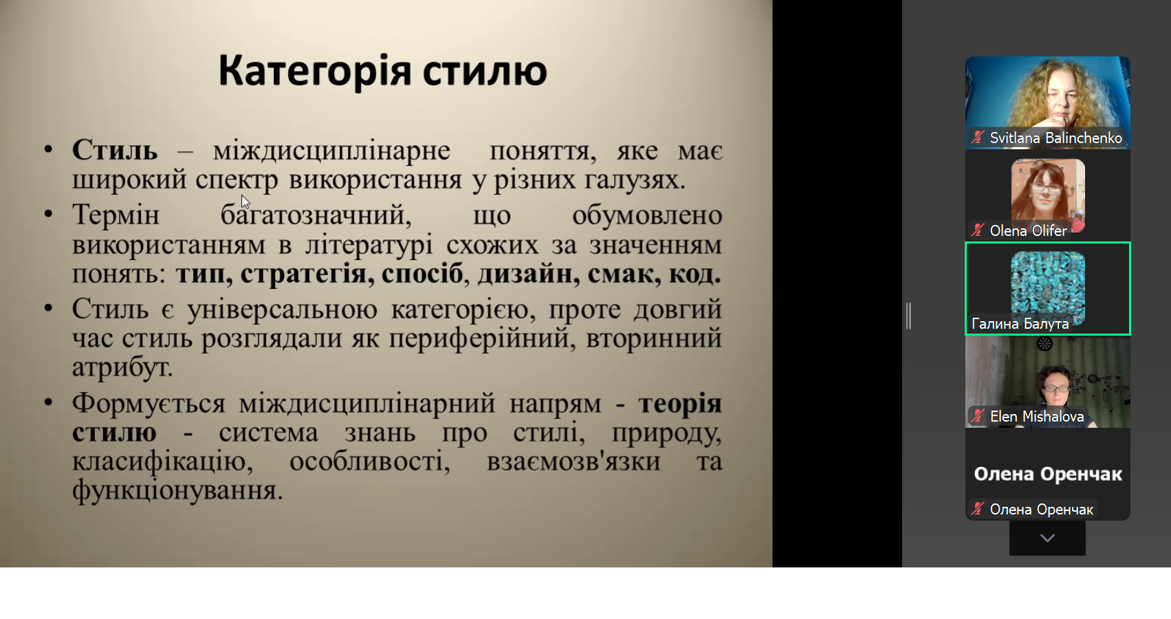 10 липня 2025 року відбулася публічна лекція к. філос. н., доц. Галини Анатоліївни Балути. Захід організовано за ініціативи доцентки кафедри філософії Чернівецького національного університету імені Юрія Федьковича Світлани Петрівни Балінченко. Темою лекції стали філософські аспекти стилю. У своїй доповіді лекторка розглянула поняття стилю з погляду естетики, теорії мистецтва, психології та соціології. Було наголошено, що у філософському дискурсі досі не існує вичерпного визначення категорії «стиль».