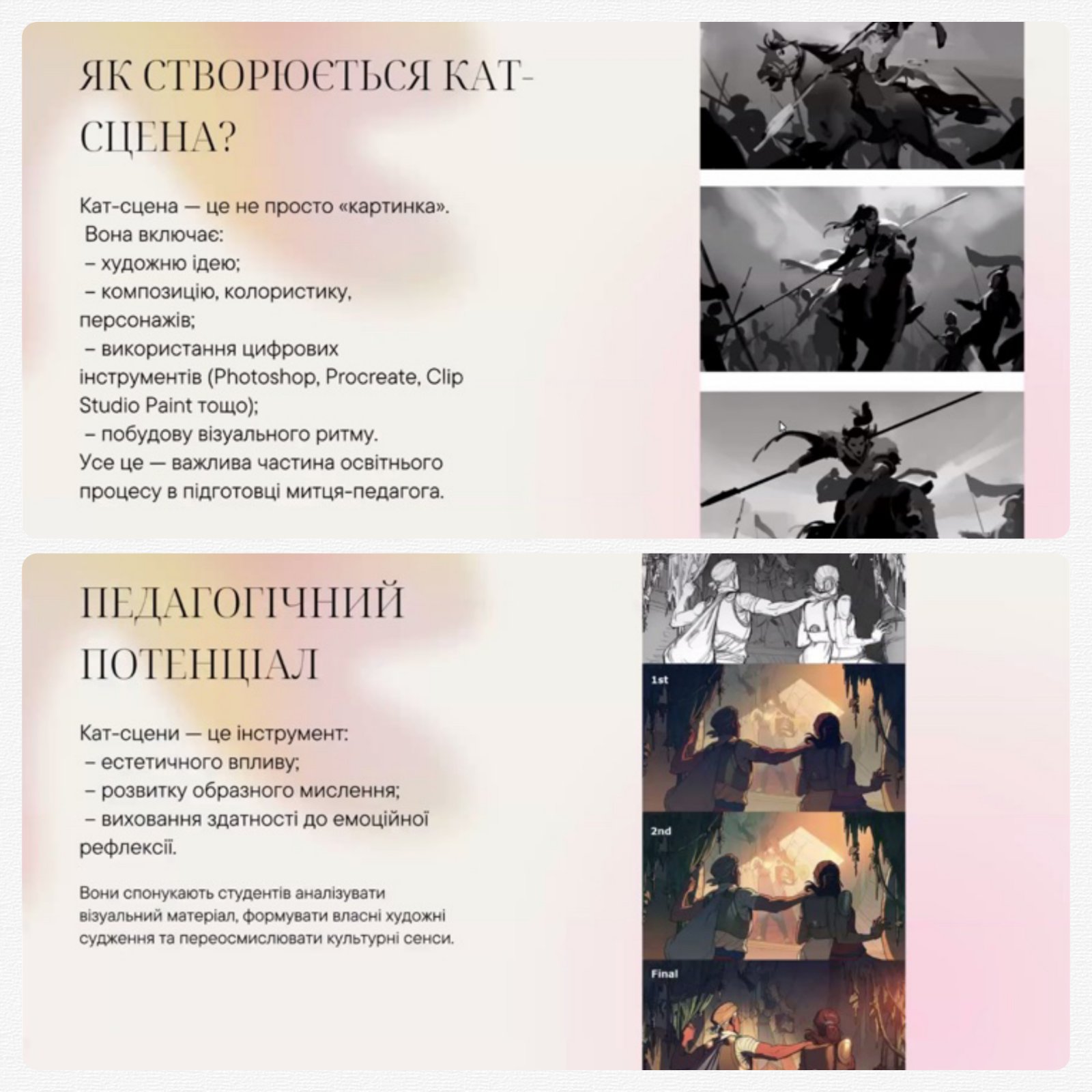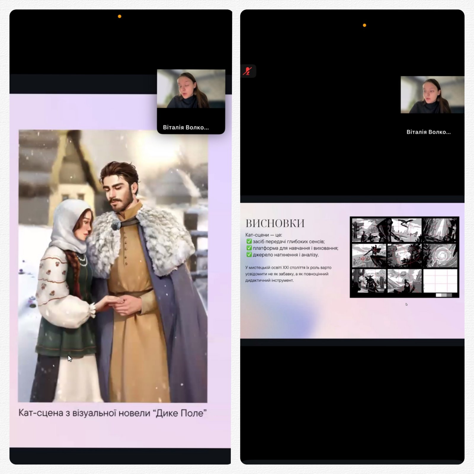 • Волкотруб Віталія, магістрантка – з доповіддю про педагогічний потенціал цифрових кат-сцен в освітньому процесі митця-педагога;