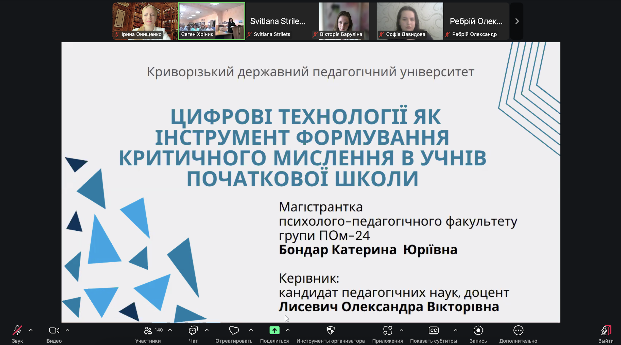 4. Бондар Катерина Юріївна, Криворізький державний педагогічний університет, тема доповіді «Цифрові технології як інструмент формування критичного мислення в учнів початкової школи» (керівник: к. пед. н., доцент Лисевич О. В.).
