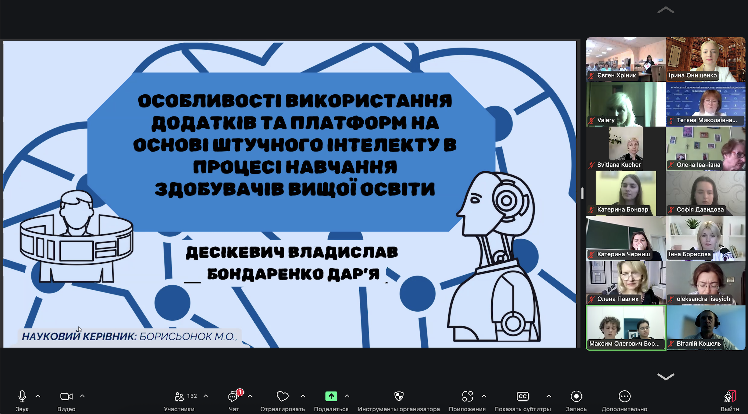 5. Десікевич Владислав В’ячеславович, Бондаренко Дарʼя Ігорівна, Український державний університет імені Михайла Драгоманова, тема доповіді «Особливості використання додатків та платформ на основі штучного інтелекту в процесі навчання здобувачів вищої освіти» (керівник: викладач Борисьонок М. О.).