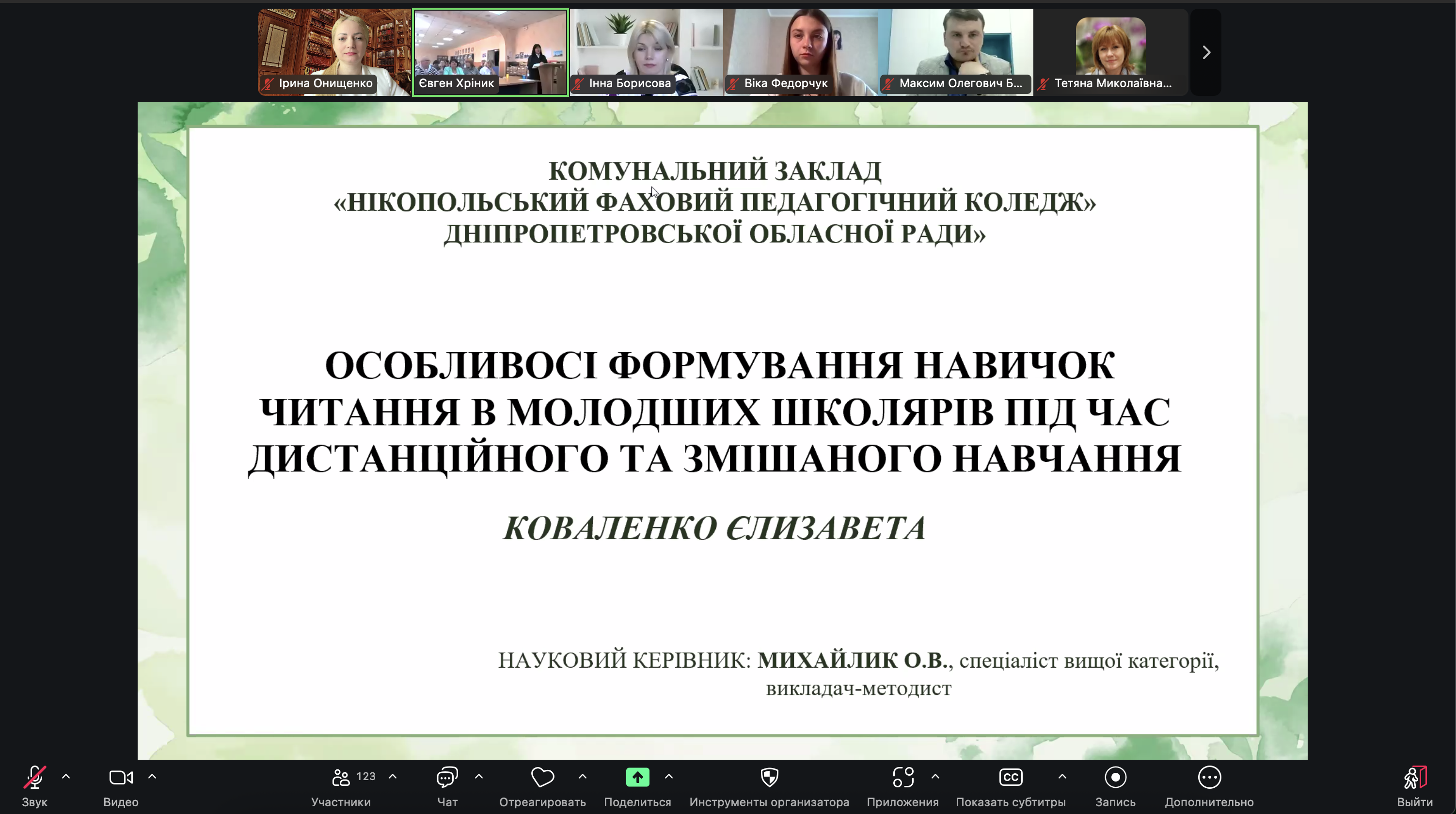 7. Коваленко Єлизавета Костянтинівна, КЗ «Нікопольський фаховий педагогічний коледж» ДОР», тема доповіді «Особливості формування навичок читання в молодших школярів під час дистанційного та змішаного навчання» (керівник: викладач Михайлик О. В.).
