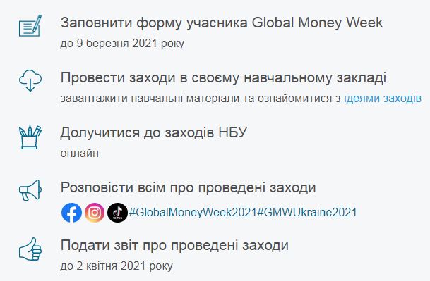 Для участі в міжнародній інформаційній кампанії з підвищення фінансової обізнаності дітей і молоді необхідно до 9 березня поточного року заповнити форму учасника. Про результати проведених заходів, присвячених Global Money Week, представники закладів освіти повинні до 2 квітня 2021 року повідомити Національний банк України, заповнивши форму звітності на сайті або за посиланням.